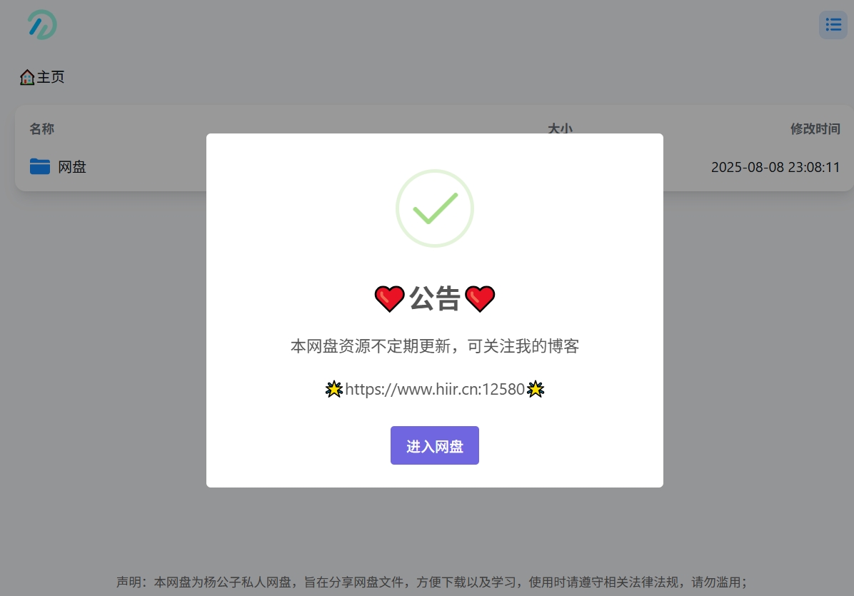 html: "本网盘资源不定期更新,可关注我的博客<br><br>🌟https://www.hiir.cn:12580🌟",